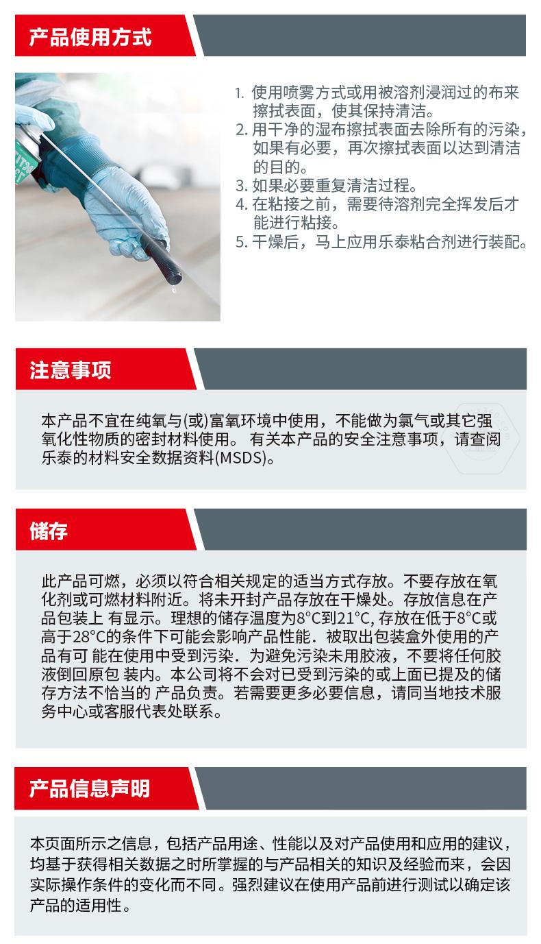 樂泰SF7070是一種無色透明溶劑型(不含氟氯烴的)部件清洗劑和脫脂劑,它經(jīng)過特別配制,可使部件與膠粘劑粘合。該產(chǎn)品適合在室溫下用做噴劑,能去除部件上的大部分油、油脂、潤滑液、金屬切削液和細(xì)粉,可安全用于鋁、橡膠和大多數(shù)塑料。