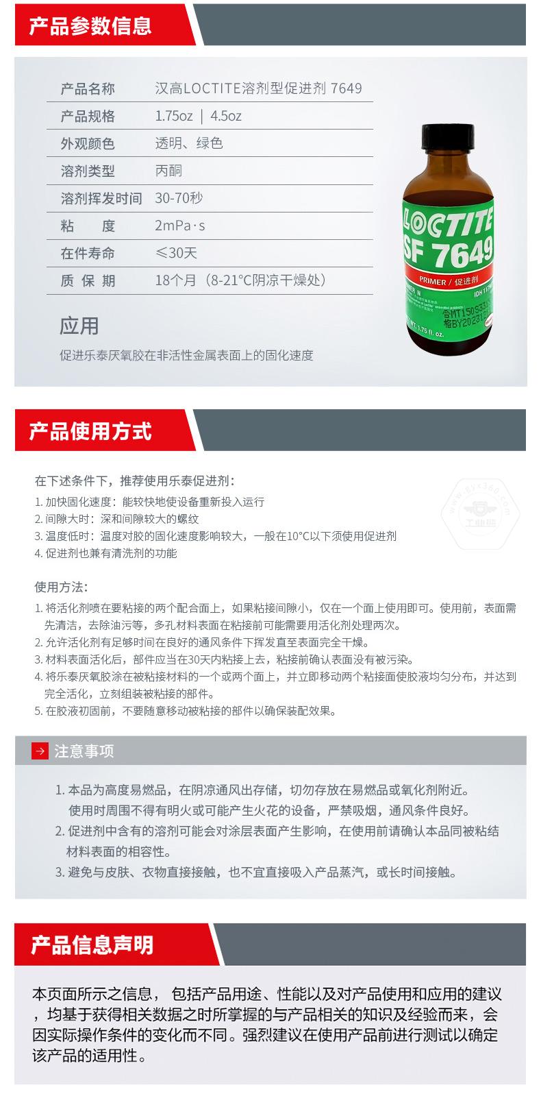 樂泰SF7649是一款用于表面處理、促進固化的溶劑型促進劑。樂泰SF7649適用于惰性金屬表面,可促進樂泰厭氧膠在非活性金屬表面的固化速度,并兼顧大間隙填充需求。對于需要加快固化速度、間隙較大,或一般在10℃以下使用促進劑的場景,樂泰SF7649更有針對性。樂泰SF7649規(guī)格為1.75oz和4.5oz,外觀為透明、綠色,溶劑類型為丙酮,溶劑揮發(fā)時間30-70秒,粘度2mPa·s,在件壽命≤30天,質保期18個月(8-21℃陰涼干燥處)。
