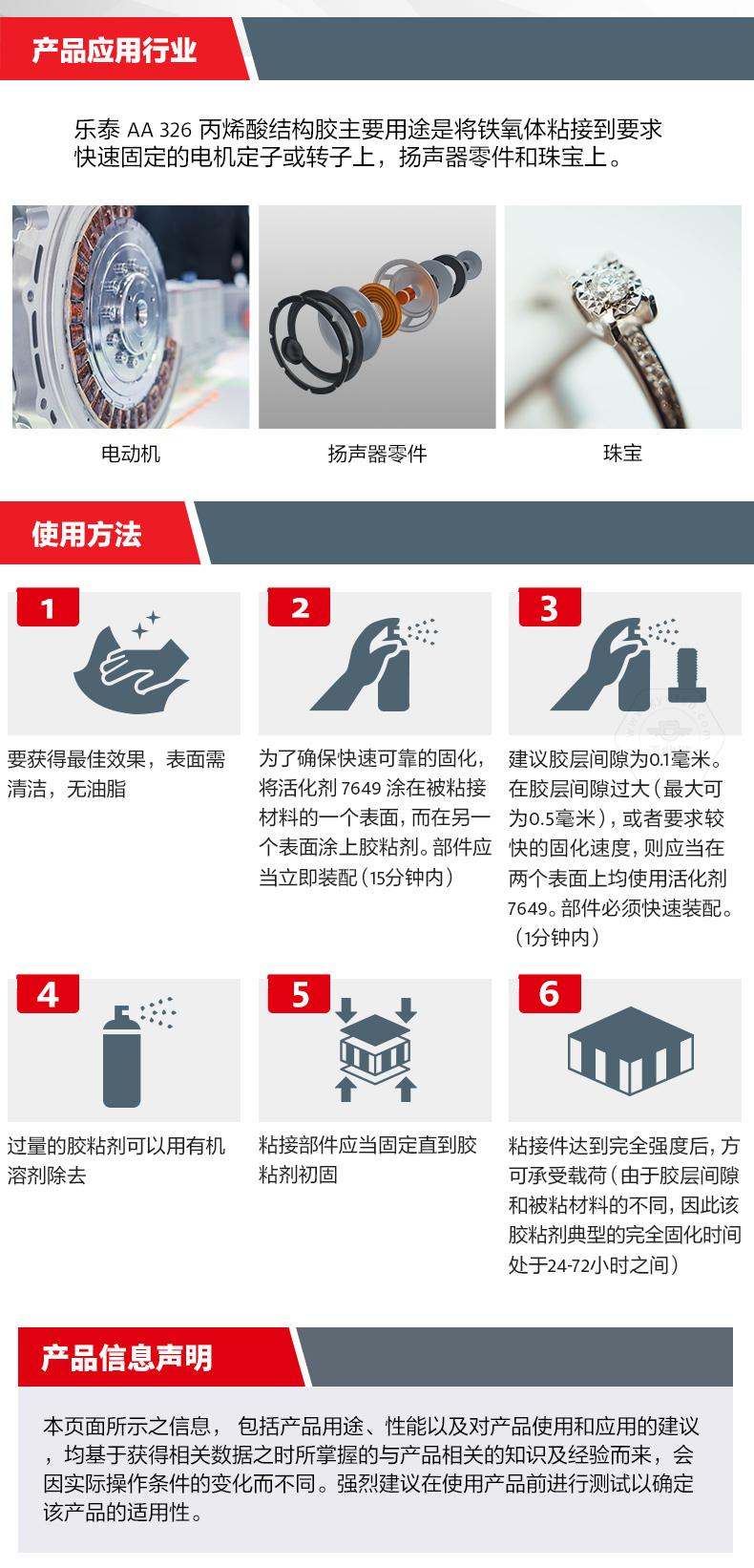 樂(lè)泰AA326丙烯酸結(jié)構(gòu)膠粘稠度適中(觸變),無(wú)需混合,適用于磁鋼及金屬部件粘接。樂(lè)泰AA326丙烯酸結(jié)構(gòu)膠僅需3分鐘即可快速固化,節(jié)省工時(shí)。樂(lè)泰AA326丙烯酸結(jié)構(gòu)膠在120℃高溫工況下效果如一,且具備高強(qiáng)度特點(diǎn)。樂(lè)泰AA326丙烯酸結(jié)構(gòu)膠主要用于將鐵氧體粘接到要求快速固定的電機(jī)定子或轉(zhuǎn)子上,也可用于揚(yáng)聲器零件和珠寶。